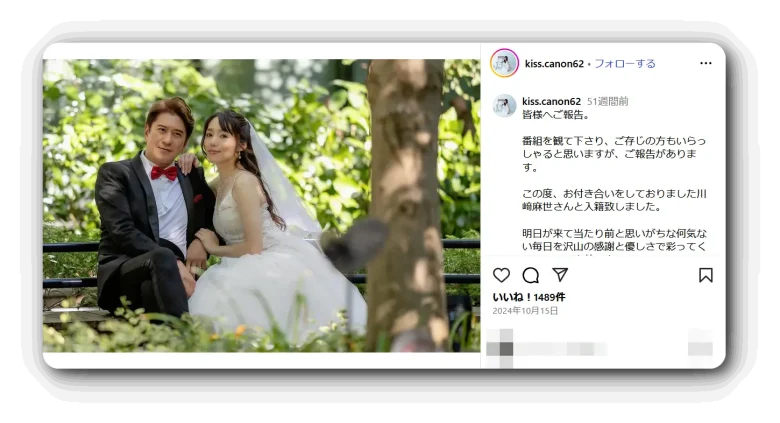 2024年10月14日、川崎麻世が自身のSNSとブログで再婚を発表しています👇